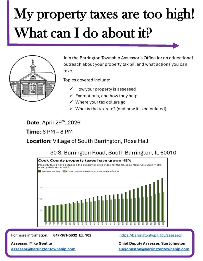 If you have questions about your property tax bill, then you should make plans to attend the Barrington Township Assessor’s Office educational workshop.