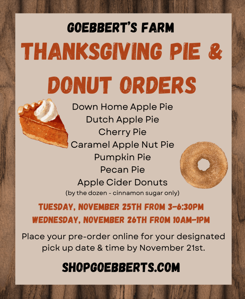The farm may be closed for the season, but they are taking Thanksgiving Pie & Donut orders. Be sure to pre-order by November 21 to enjoy these seasonal treats. Your Thanksgiving dinner won’t be complete without them!